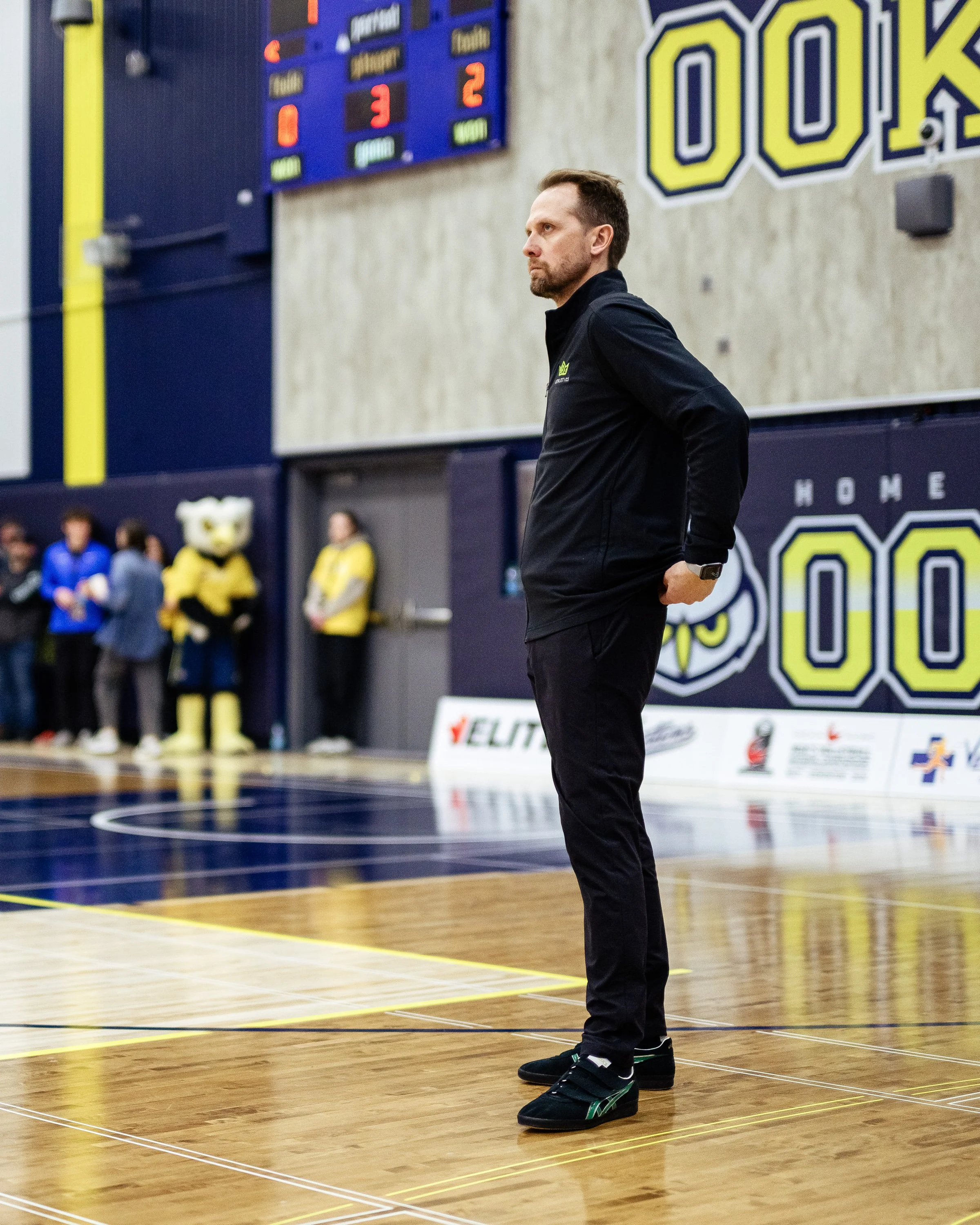 Aaron Schulha coaches the Red Deer Polytechnic Kings during the CCAA men’s volleyball championship gold medal match at NAIT Gymnasium in Edmonton on Saturday, March 14, 2026.