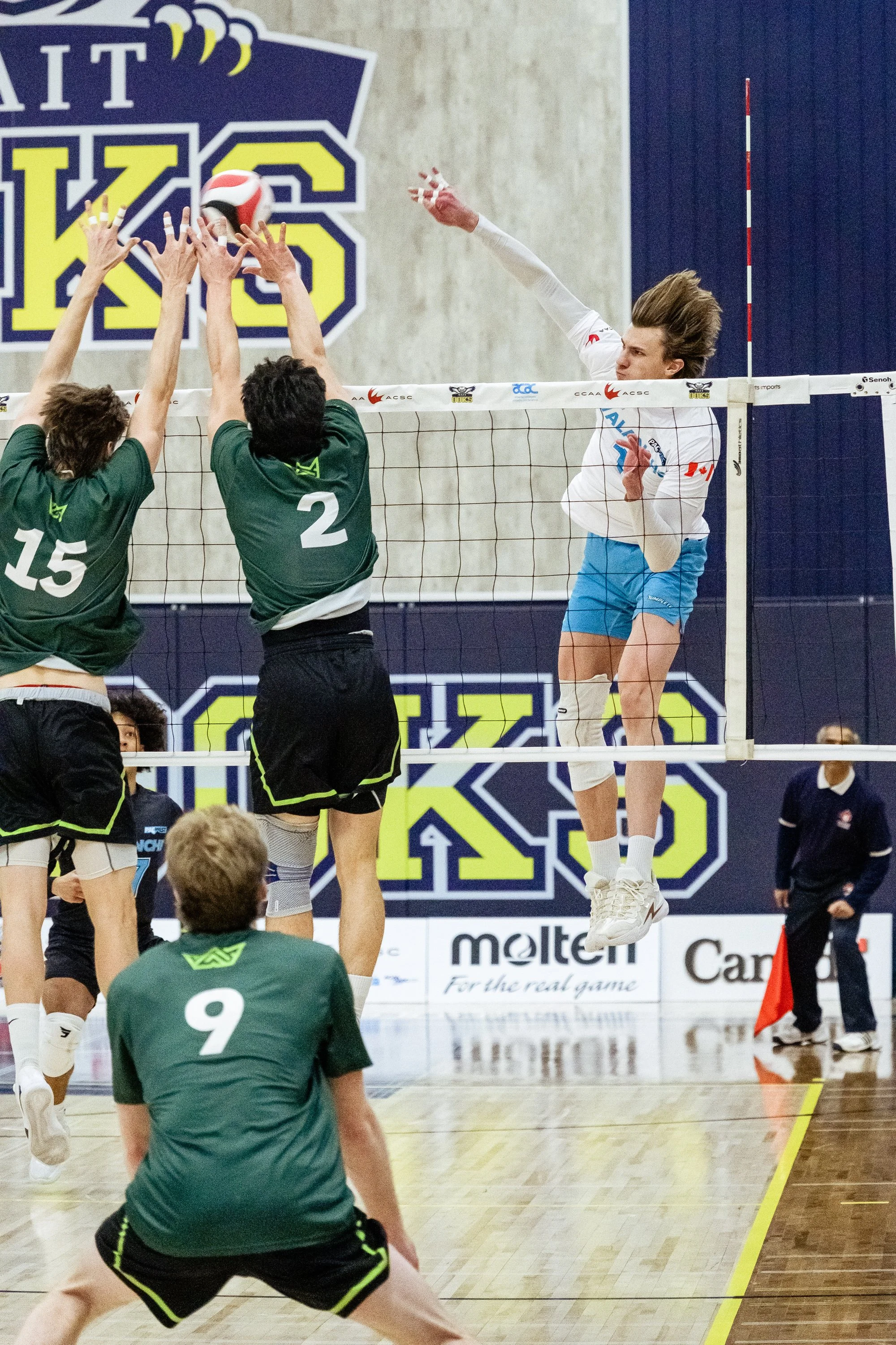 Owen Langberg (centre) of the Red Deer Polytechnic Kings tosses the ball against Julius Molnar (centre) of the College of the Rockies Avalanche during the CCAA men’s volleyball championship gold medal match at NAIT Gymnasium in Edmonton on Saturday, March 14, 2026.